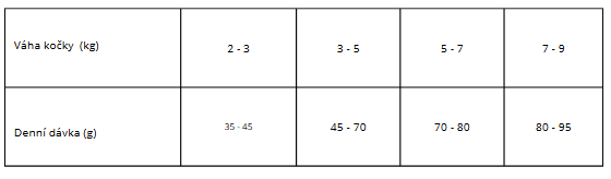 vitamín A (3a672a) 20 000 IU, vitamín D3 (E671) 800 IU, vitamín E (3a700) 600 mg, vitamín C (3a312) 300 mg, taurin (3a370) 2 500 mg, L-karnitin (3a910) 50 mg, cholinchlorid (3a890) 2 500 mg, biotin (3a880) 2 mg, vitamín B1 (3a821) 10 mg, vitamín B2 12 mg, niacinamid (3a315) 50 mg, D-pantothenan vápenatý (3a841) 40 mg, vitamín B6 (3a831) 10 mg, kyselina listová (3a316) 2 mg, vitamín B12 0,04 mg, zinek (3b606) 120 mg, železo (3b106) 45 mg, mangan (3b504) 55 mg, jodid draselný (3b201) 4 mg, měď (3b406) 10 mg, selen (3b8.10) 0,2 mg, L-methionin (3c305) 2 000 mg. Metabolizovatelná energetické hodnota: 3,640 kcal/kg.
