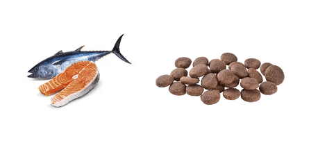 Losos (48 %) (dehydrovaný losos, hydrolyzovaný losos), brambory (30 %), sušená jablečná dužina, kuřecí tuk, lososový olej (3 %), přírodní aroma, pivovarské kvasnice, hrachová mouka, glukosamin (260 mg/kg), frukto-oligosacharidy (200 mg/kg), chondroitin sulfát (200 mg/kg), mannan-oligosacharidy (150 mg/kg), juka schidigera (150 mg/kg), semena ostropestřce mariánského (90 mg/kg), β-glukany (50 mg/kg), sušený srdečník (50 mg/kg), sušený rakytník řešetlákový (50 mg/kg), probiotika Lactobacillus helveticus HA – 122 inaktivováno (15x109 buněk/kg).
