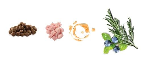 Kuře 50 % (dehydrované 30 %, vykostěné 20 %), oves, pšenice, kuřecí tuk (konzervovaný směsí tokoferolů), kukuřice, lososový olej 2 %, sušená jablka, hydrolyzovaná kuřecí játra, pivovarské kvasnice, kolagen, ulity korýšů (zdroj glukosaminu) 260 mg/kg, chrupavky (zdroj chondroitinu) 180 mg/kg, byliny a ovoce (hřebíček, citrusy, rozmarýn, kurkuma) 150 mg/kg, mannan-oligosacharidy 150 mg/kg, fruktooligosacharidy 100 mg/kg, juka mohave 100 mg/kg, sušený heřmánek 90 mg/kg, slávka zelenoústá (zdroj glycosaminoglykanů) 60 mg/kg, sušené borůvky 60 mg/kg.