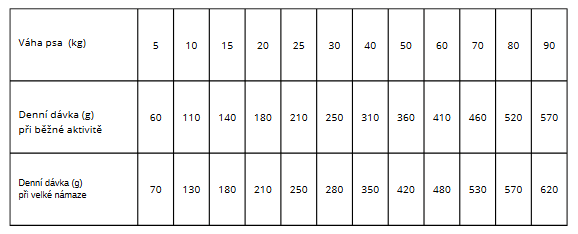 Hrubý protein 31 %, obsah tuku 22 %, vlhkost 10 %, hrubý popel 7 %, hrubá vláknina 1,5 %, vápník 1,5 %, fosfor 1,1 %, Omega-3 0,25 %, Omega-6 2,5 %.