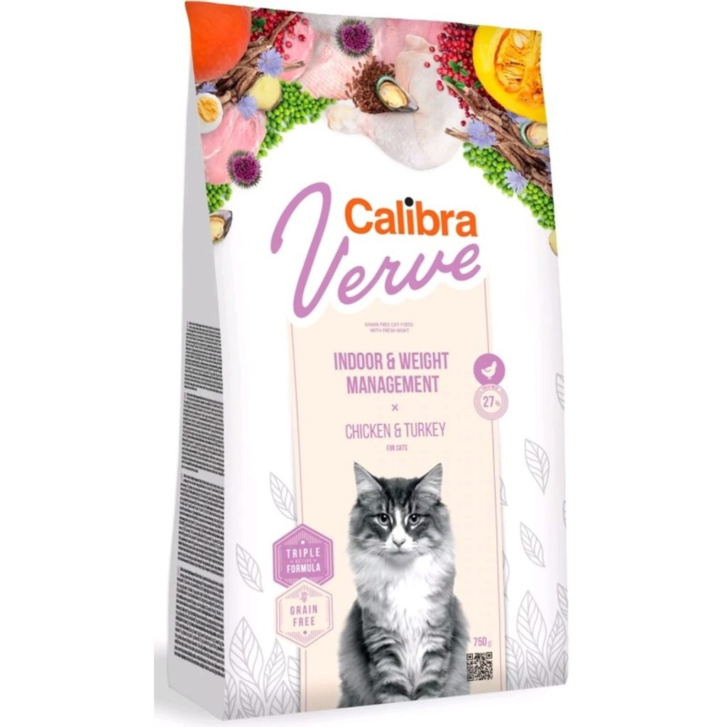Calibra Cat Verve Indoor + Weight Management Chicken & Turkey je kompletní krmivo s kuřetem a krůtou, bez obilovin, s vysokým obsahem čerstvého masa. Receptura je určená pro kočky žijící v domácnosti a také pro ty, které potřebují ohlídat linii. Čerstvé maso z kuřete v této receptuře tvoří 27 % celkového obsahu. Proteiny živočišného původu 80,8 %.
