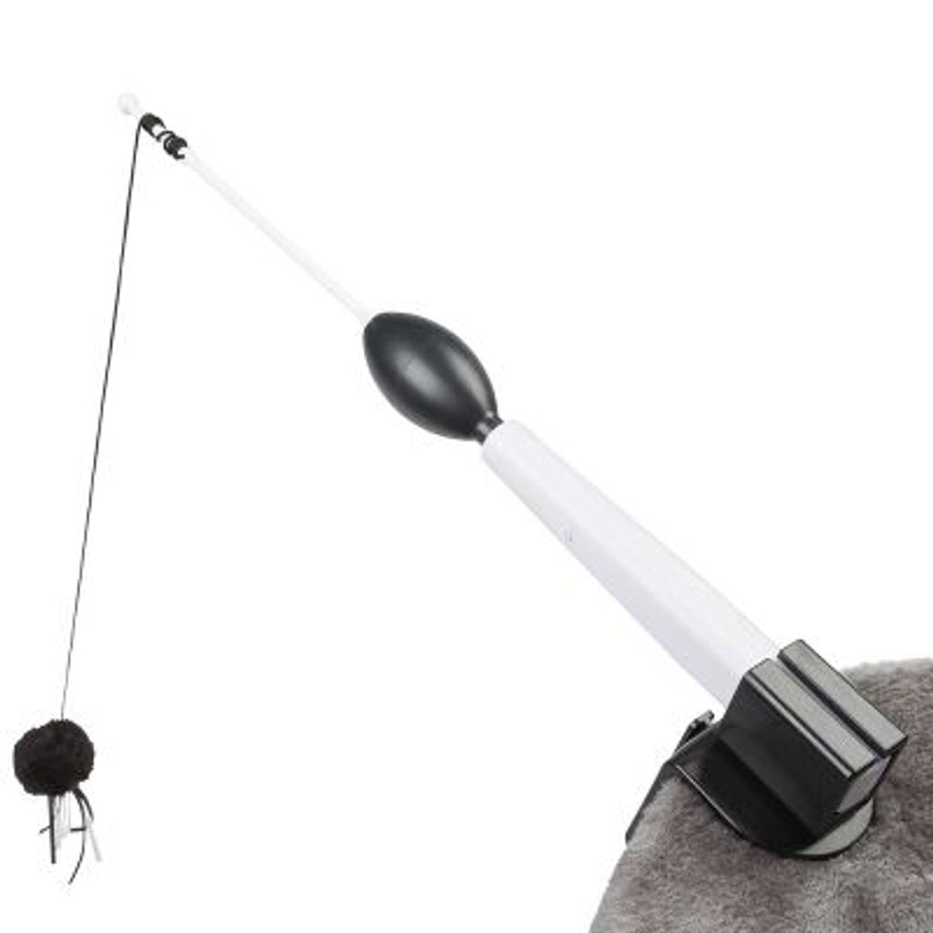 Toto rozkošné škádlítko pro kočky značky EYENIMAL je plně automatizované. Stuha se navíjí a odvíjí podél tyče díky motorizovanému systému, který způsobuje, že se nástavec se stuhou otáčí nahoru a dolů. Zábavnou hračku můžete připevnit na různé kusy nábytku (kočičí strom, škrabadlo atd.) pomocí klipu nebo pásky na suchý zip, které jsou součástí balení. Rukojeť je odnímatelná, abyste mohli hračku ovládat i ručně, veselá bambule a třásně na konci tyče pobízí kočku ke hře. Hračka funguje na 2x 1,5V AAA baterie, které nejsou součástí balení. Rozměry hračky jsou D 35 × Š 3 × V 3 cm.