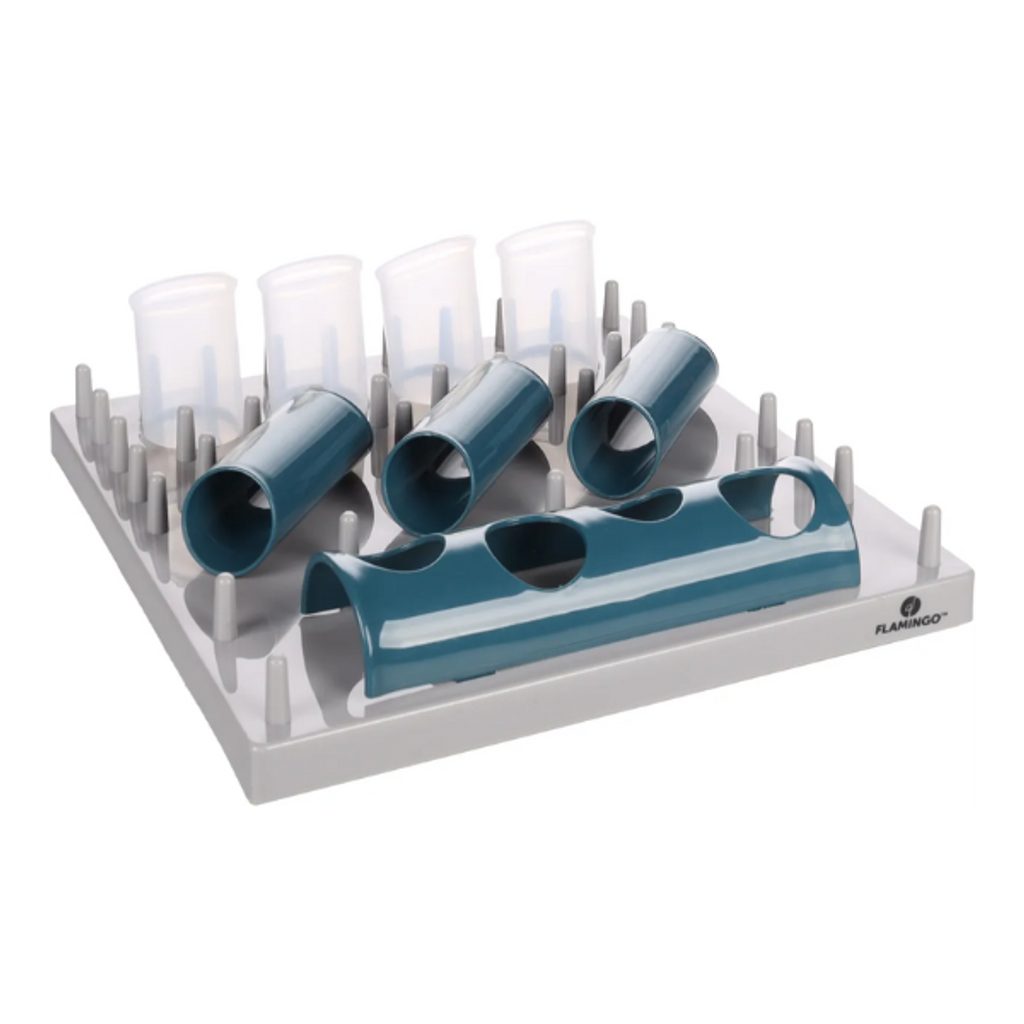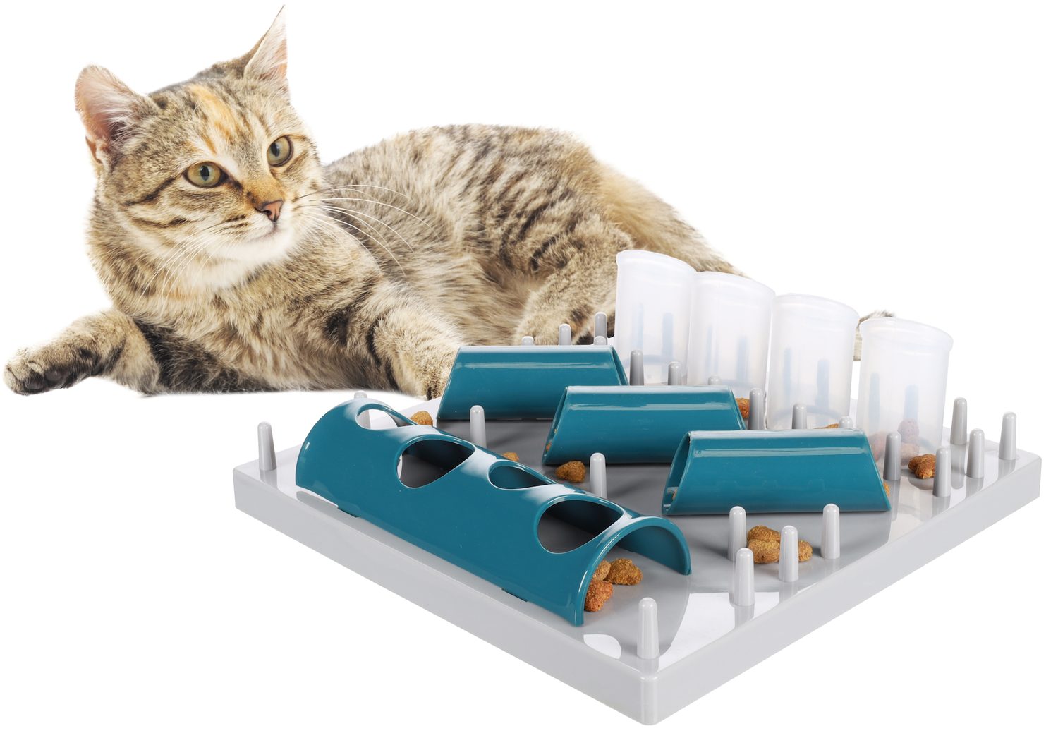 Interaktivní a náročná hračka se skládá ze 3 částí a nabízí vaší kočce zábavnou pamlskovou výzvu! Hrací deska se skládá z kolíků, tunelů a dóziček, do kterých lze zábavným způsobem schovat, nebo je naplnit oblíbenými pamlsky. Hru můžete využít ke krmení, jako protihltací misku, což pomáhá odstranit nadýmání a zažívací problémy vašich domácích mazlíčků.