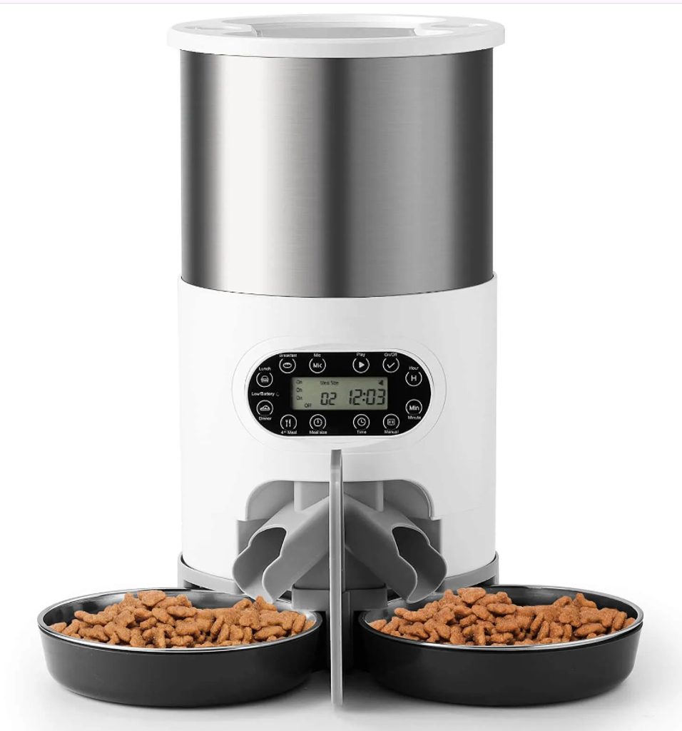 Automatické krmítko s objemem 4,5 litru je ideálním řešením pro ty, kteří mají více než jednoho domácího mazlíčka. Toto duální inteligentní krmítko s automatickým dávkovačem umožňuje krmit dvě zvířata současně a zajišťuje, že jejich potřeby krmiva budou uspokojeny i v době vaší nepřítomnosti. Díky důmyslnému designu si kočky nebudou lézt do jídla. Do dávkovače je vhodné dávat suché krmivo do velikosti 12mm. Disponuje přehledným displejem a možností přehrát nahraný hlas. Navíc je vybaven duálním zdrojem energie, takže se vám nestane, že váš mazlíček zůstane bez jídla ani při výpadku proudu.