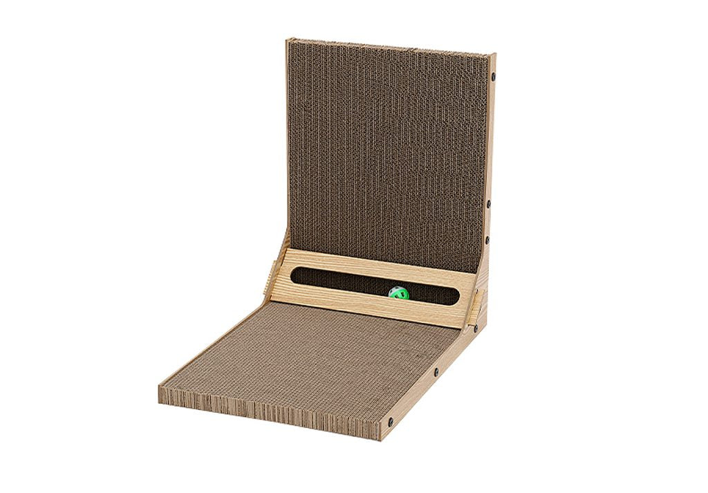 Škrabadlo kombinuje funkce horizontálního a vertikálního škrabadla a vytváří roh, na kterém může kočka ležet, škrábat a hrát si. Vybaveno tunelem s míčkem, který poskytuje další zábavu. Uspokojuje potřeby škrábání a broušení drápků a poskytuje kočce dlouhé chvíle relaxace. Díky pevné konstrukci z kartonu s vyztuženými bočnicemi je škrabadlo odolné a chrání nábytek a dveře před zničením.