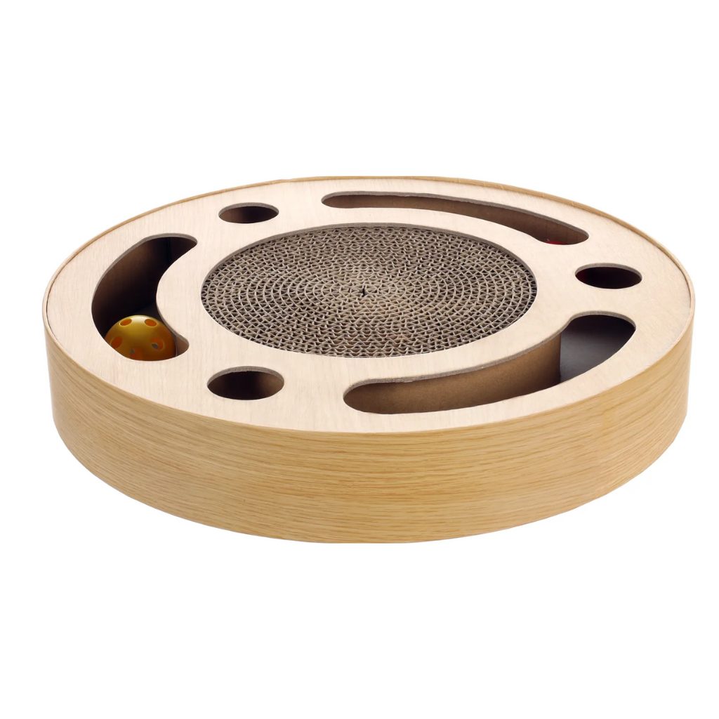 Zábavné škrábací bludiště se dvěma míčky je vyrobeno z lepenkového papíru. Bludiště má škrábací plochu uprostřed, kde si může kočička brousit drápky o kartonový střed. Po obvodu jsou mezery ve kterých je umístěny chrastící míčky, které se točí v kruhu a kočička se je snaží chytit. Hru můžete zatraktivnit posypáním středu šantou kočičí, kterou kočky milují a zároveň podporuje jejich lovecký instinkt!